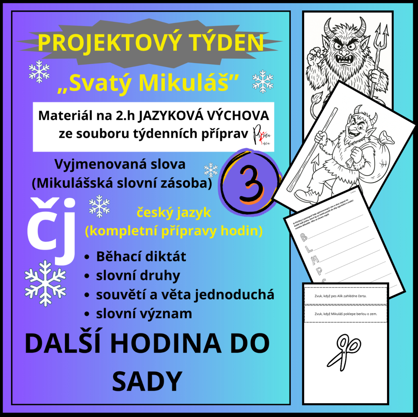 Materiál obsahuje kompletní 45minutovou přípravu na jazykovou výchovu v rámci projektového mikulášského týdne. Hodina propojuje učivo (slovní druhy, vyjmenovaná slova, citoslovce, mluvnické kategorie) s tematickým obsahem spojeným s tradicí svatého Mikuláše.