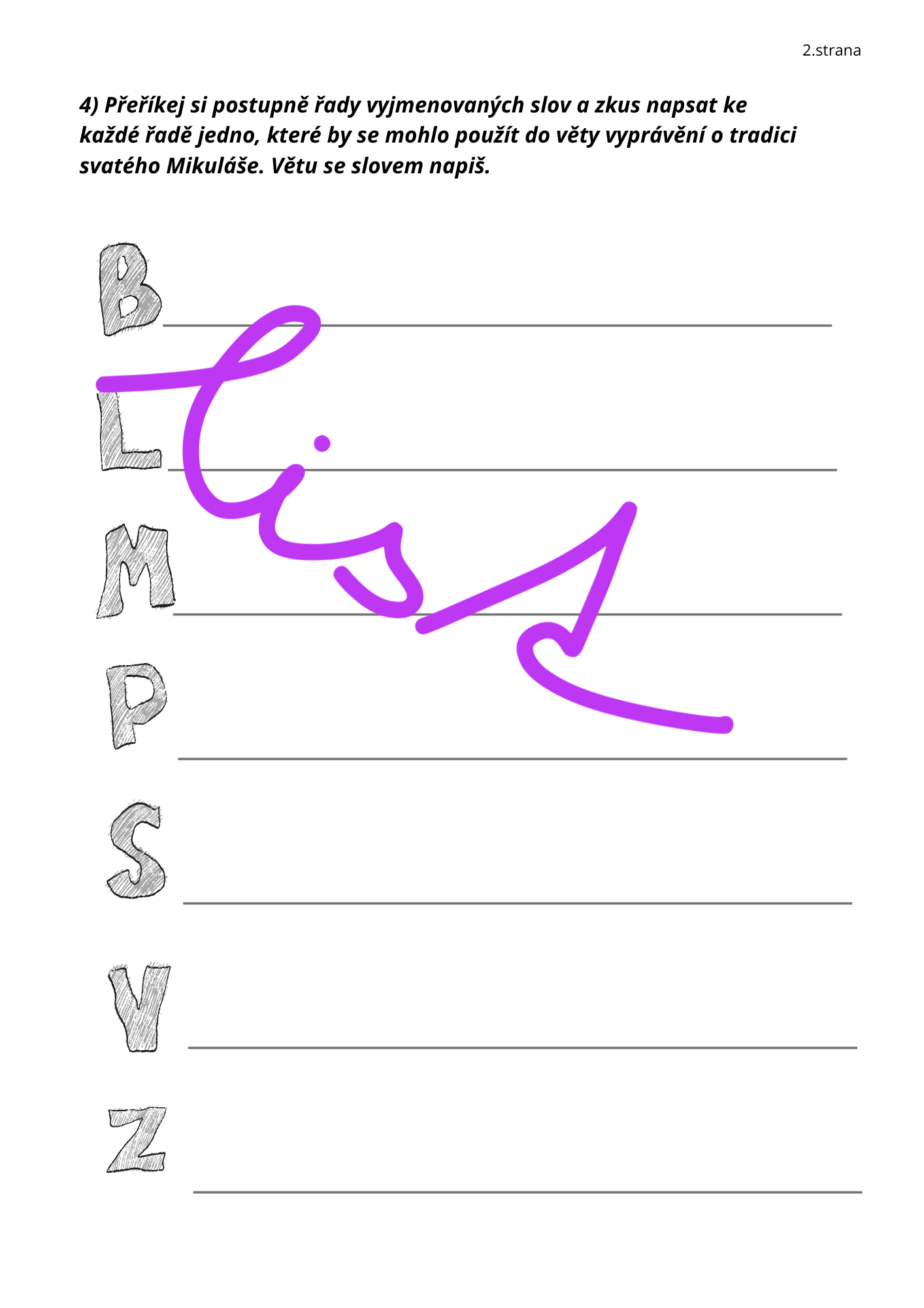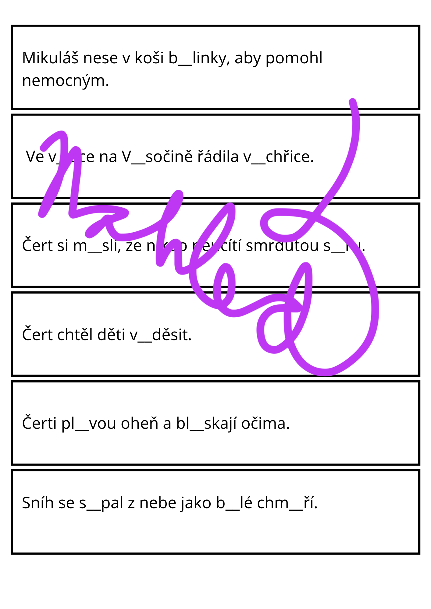 - Vyjmenovaná slova – použití v kontextu: každé dítě doplní vyjmenované slovo do tematické věty o mikulášské tradici.