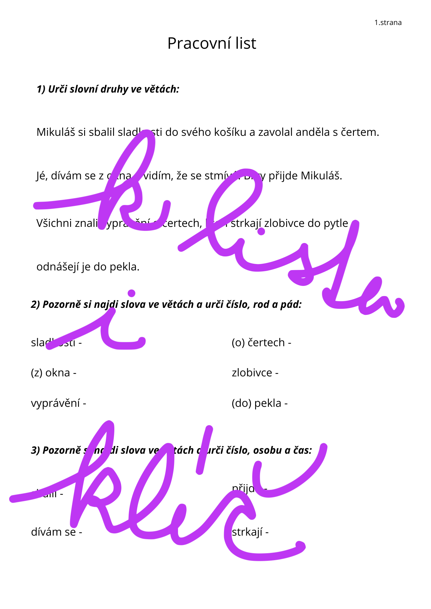 - Určování slovních druhů ve třech větách z mikulášského prostředí.