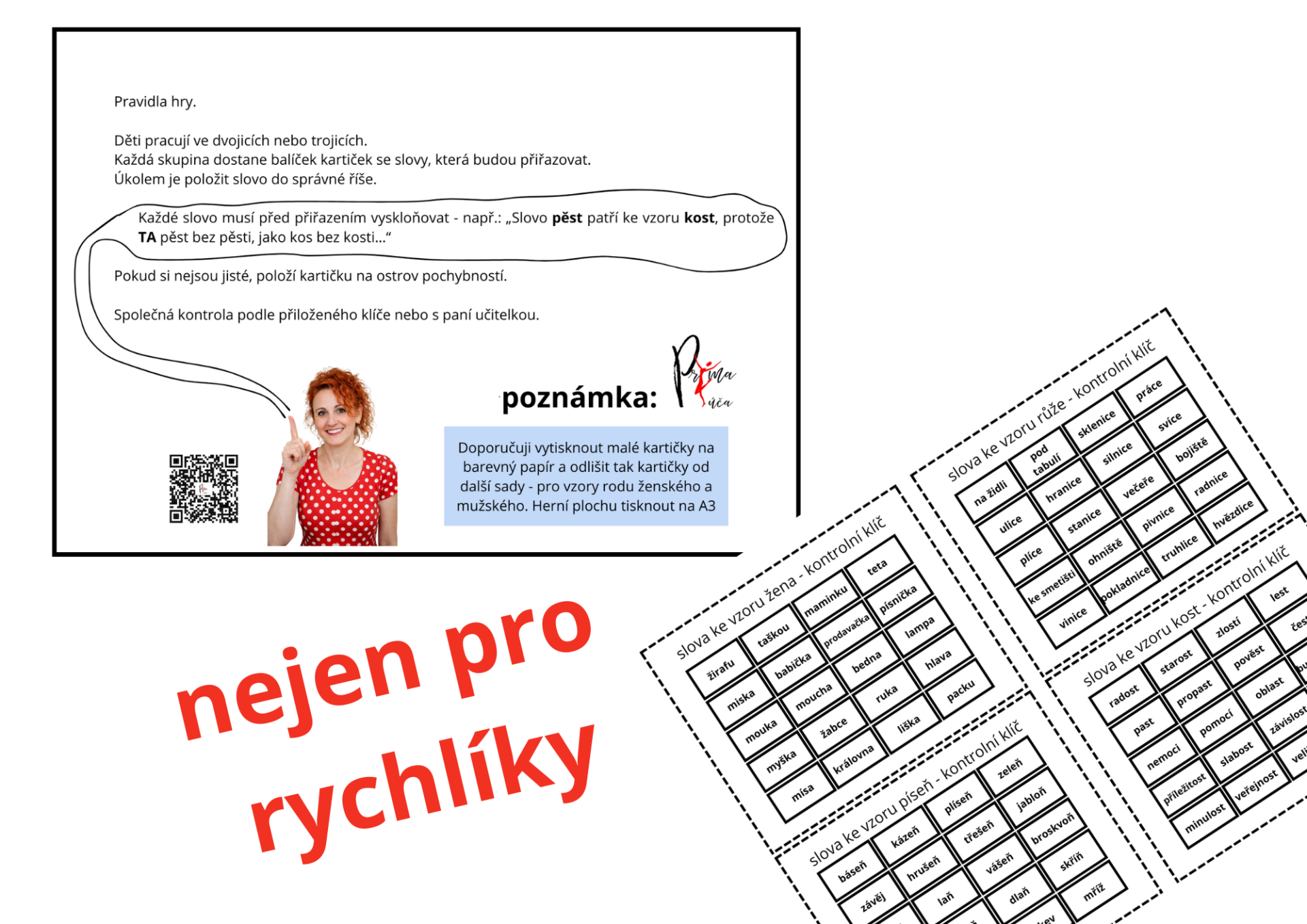 tato didaktická hra je zaměřena na procvičování rozlišování podstatných jmen rodu ženského a jejich přiřazování ke vzorům žena, růže, píseň a kost. Cílem hry je, aby si žáci upevnili porozumění jednotlivým vzorům, naučili se je rozpoznávat pomocí skloňování a dokázali své rozhodnutí jednoduše zdůvodnit. Hra vede děti k vědomé práci s jazykem a potlačuje pouhé tipování.