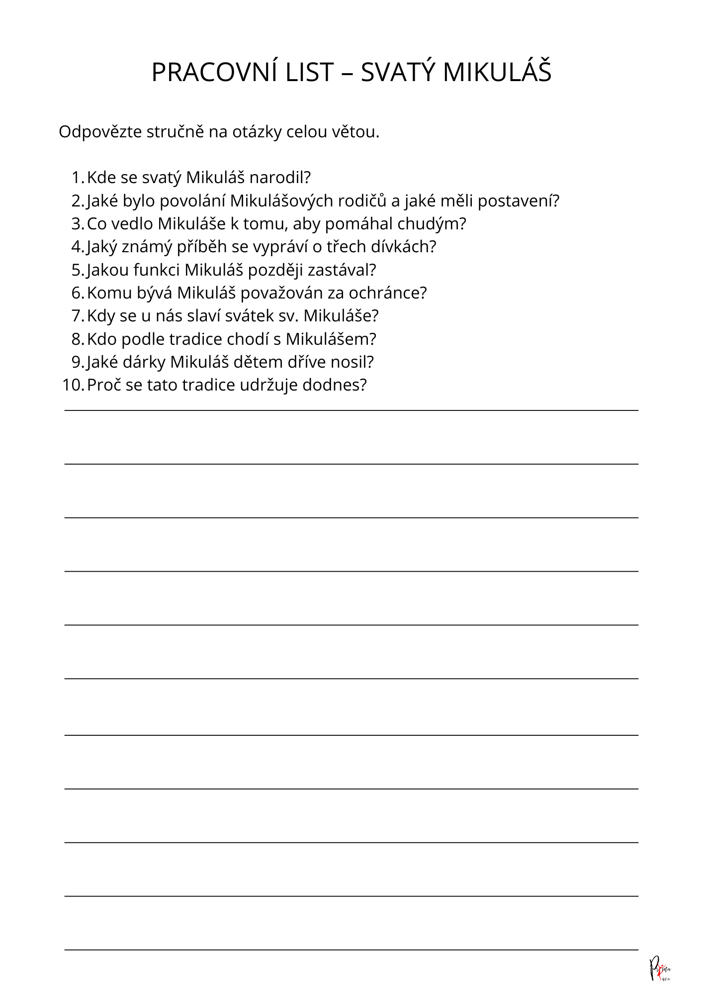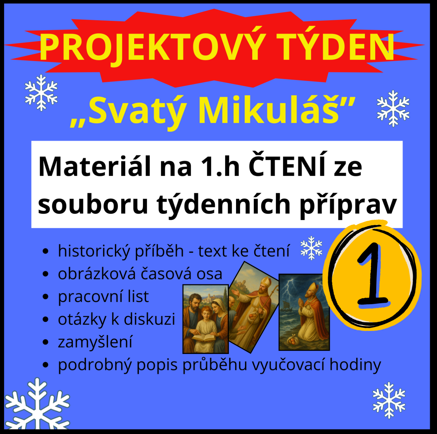 Tento výukový materiál je určen pro žáky 4. a 5. třídy základní školy a slouží k práci v hodinách čtení, literární výchovy a také jako doplňující podpora při výuce o lidových tradicích. Materiál kombinuje dětsky srozumitelný text o životě svatého Mikuláše s bohatou obrázkovou časovou osou a navazujícím pracovním listem k rozvoji čtenářské gramotnosti.
