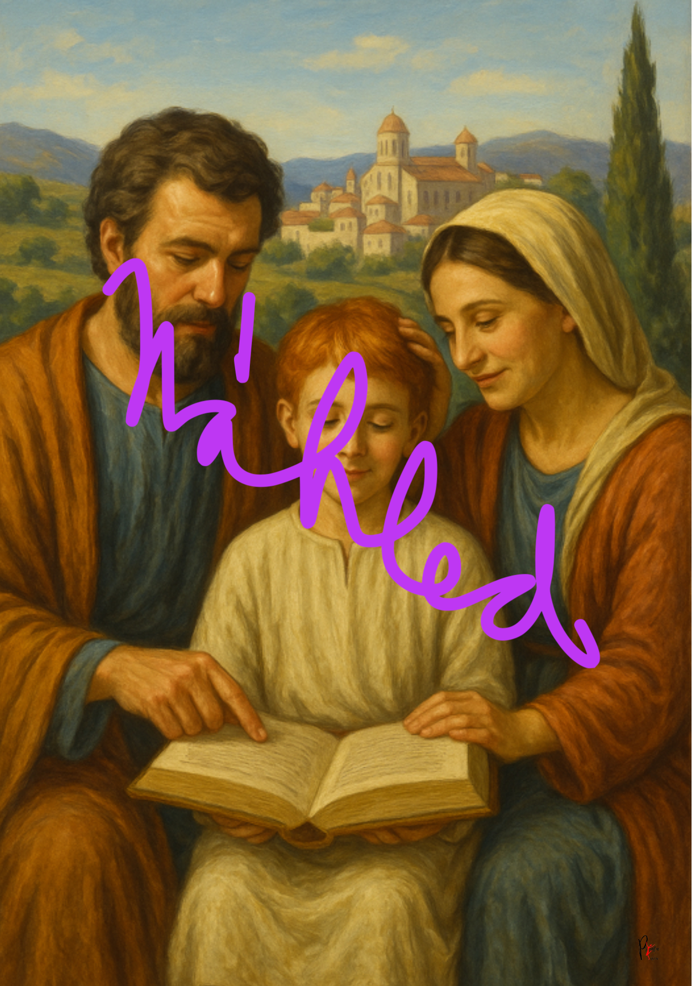 - Mikuláše v dětství, sedícího mezi rodiči, kteří ho vzdělávají a vedou k víře.