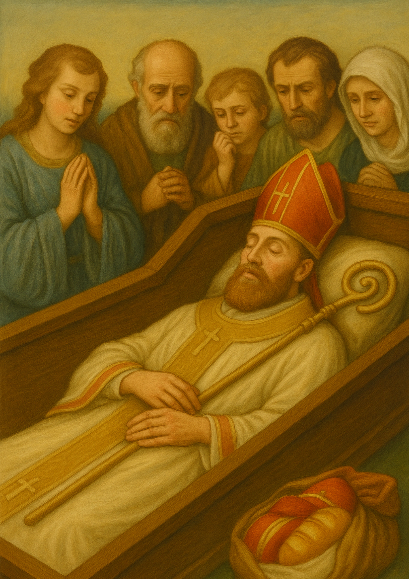 - Mikuláše jako biskupa, jak pomáhá chudým lidem a rozdává jídlo.
