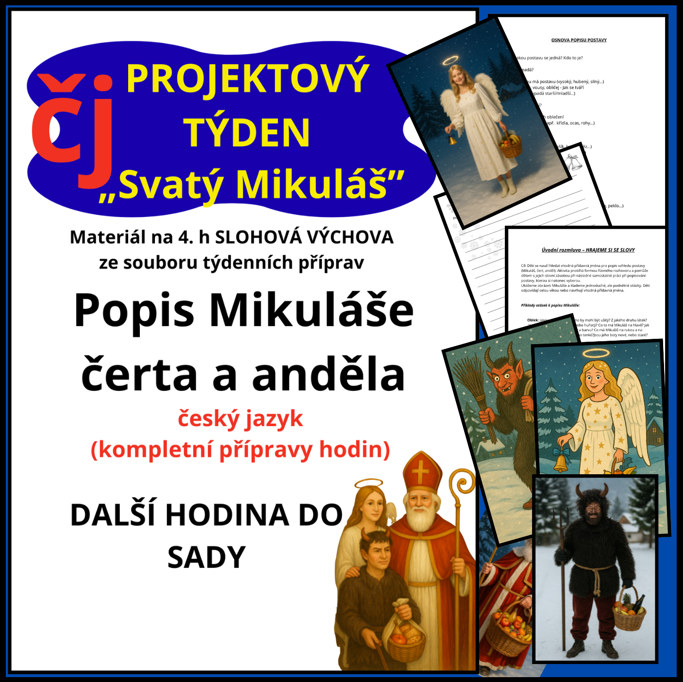 v tomhle materiálu najdete vše, co budete potřebovat k tomu, abyste s dětmi pohodově zvládly popis postavy a zároveň si užily krásnou předvánoční atmosféru. Připravila jsem pro vás kompletní přípravu hodiny slohové výchovy, která se dá krásně zapojit do projektového týdne „Svatý Mikuláš“, nebo použít i samostatně.