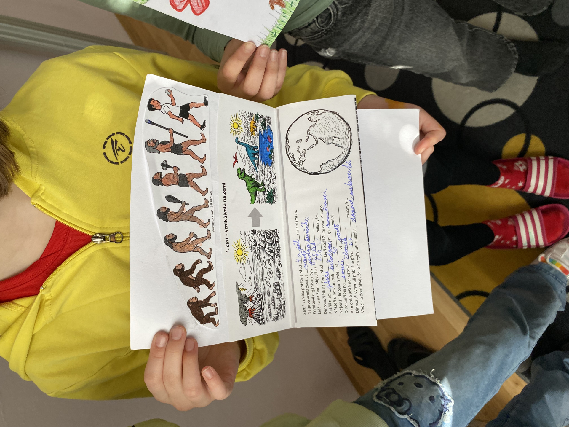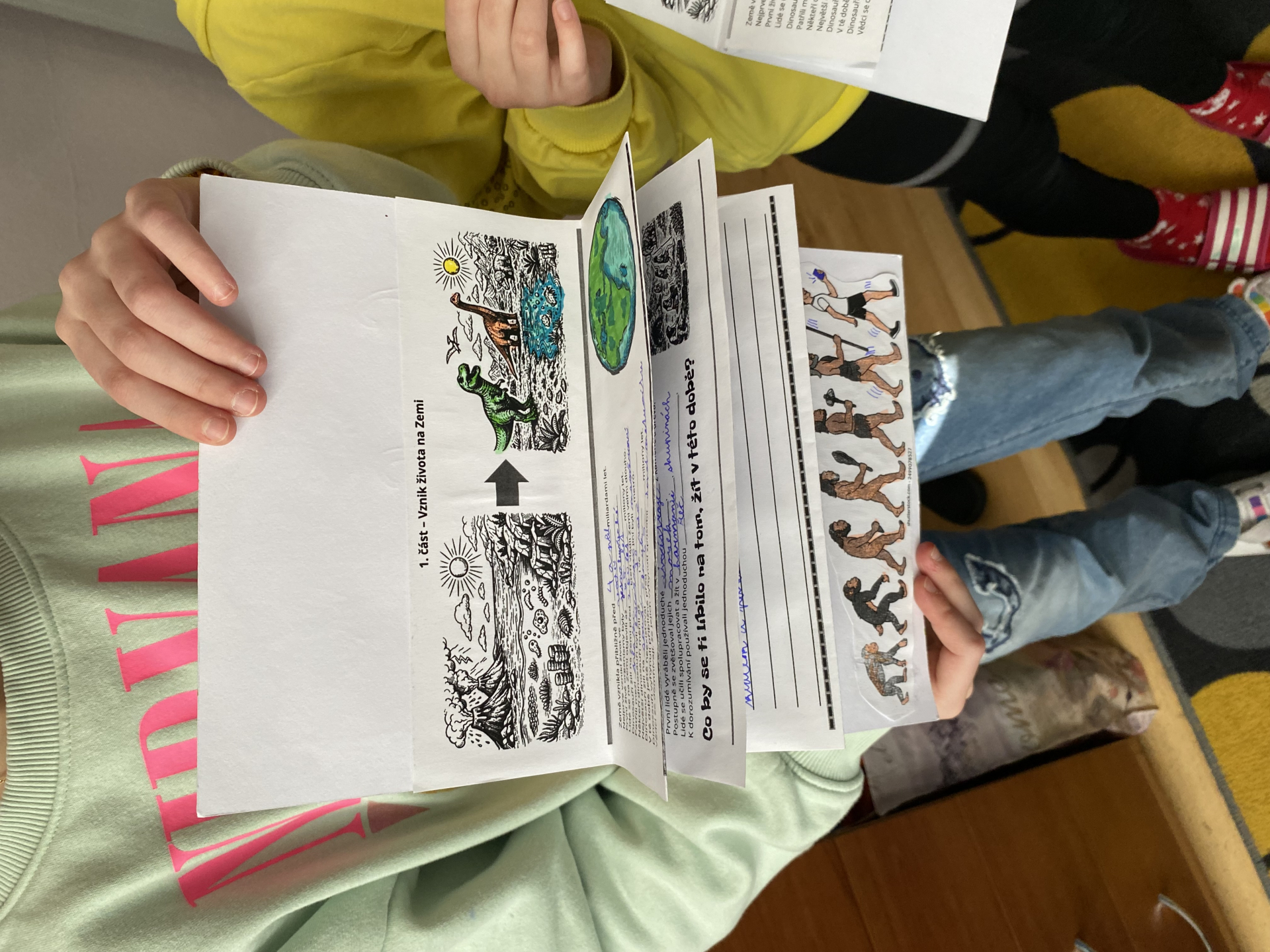 Zvolila jsem formu skládacího modelu, protože dětem pomáhá lépe chápat časovou posloupnost a souvislosti. A asi je to lepší, než psaní do sešitu. Jednotlivé části na sebe plynule navazují a společně vytvářejí příběh vývoje Země a člověka. Děti nejprve pracují s úvodní částí zaměřenou na vznik planety Země (vše stručně) a první formy života. Následuje období dinosaurů, které je zpracováno tak, aby děti jasně pochopily, že dinosauři nežili společně s lidmi a že člověk se na Zemi objevil až mnohem později.