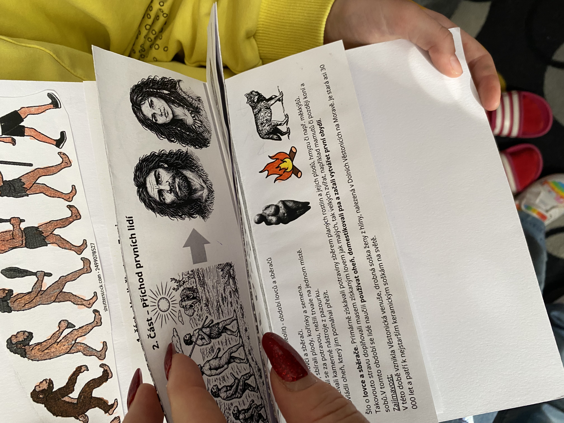 Další části materiálu se věnují příchodu prvních lidí a jejich postupnému vývoji. Pomocí obrázků, doplňovacích vět a výkladových textů děti zjišťují, proč byla důležitá vzpřímená chůze, jak se vyvíjel lidský mozek, proč lidé žili ve skupinách a jak se dorozumívali. Velký prostor je věnován každodennímu životu pralidí, zejména výrobě prvních nástrojů z pazourku, jejich využití a významu pro přežití celé tlupy. Záměrně zde propojuji učivo s územím České republiky, aby si děti uvědomily, že pravěk se netýkal jen vzdálených míst, ale i krajiny, ve které dnes žijeme.