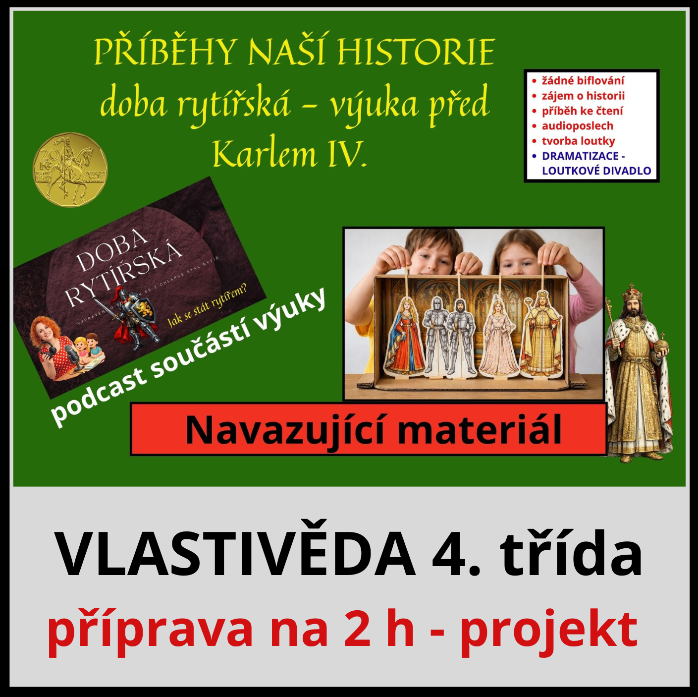 Tento výukový materiál je koncipován jako komplexní a propojený celek, který přirozeně spojuje poznávání historie, čtenářskou gramotnost, poslech, tvořivou činnost i dramatizaci. Je zaměřen na období středověku, konkrétně na dobu rytířů před vládou Karla IV., a vede žáky k porozumění této době prostřednictvím příběhu a vlastní zkušenosti.