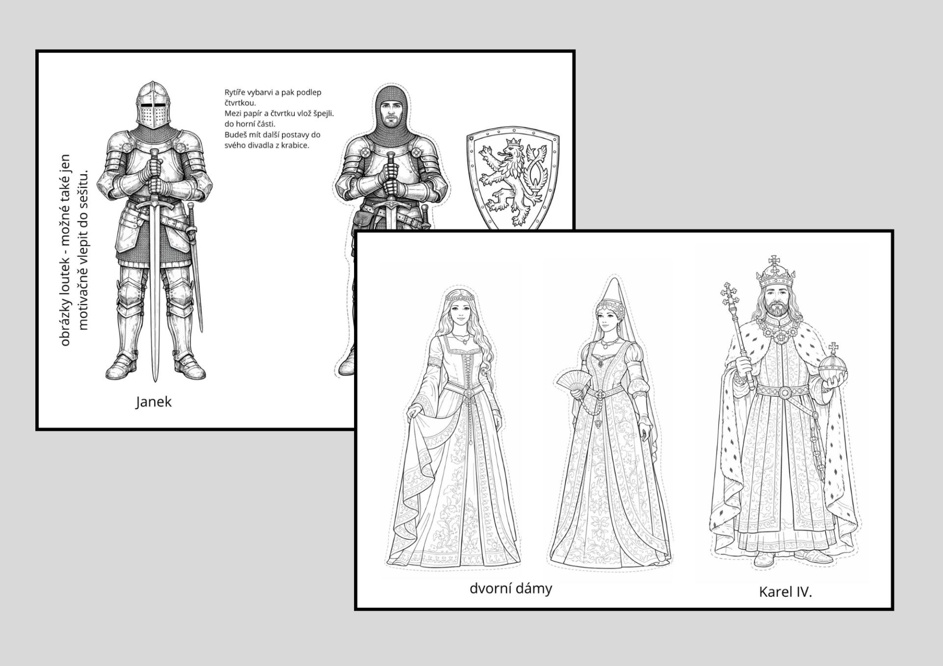 Důležitou součástí materiálu jsou výtvarné podklady pro tvorbu loutek. Žáci pracují s připravenými postavami (rytíři, dvorní dámy, Karel IV.), které vybarvují, vystřihují a doplňují špejlí, čímž vznikají jednoduché loutky pro divadélko . Tato činnost rozvíjí jemnou motoriku, pracovní postupy i estetické vnímání a zároveň připravuje žáky na další fázi – dramatizaci.