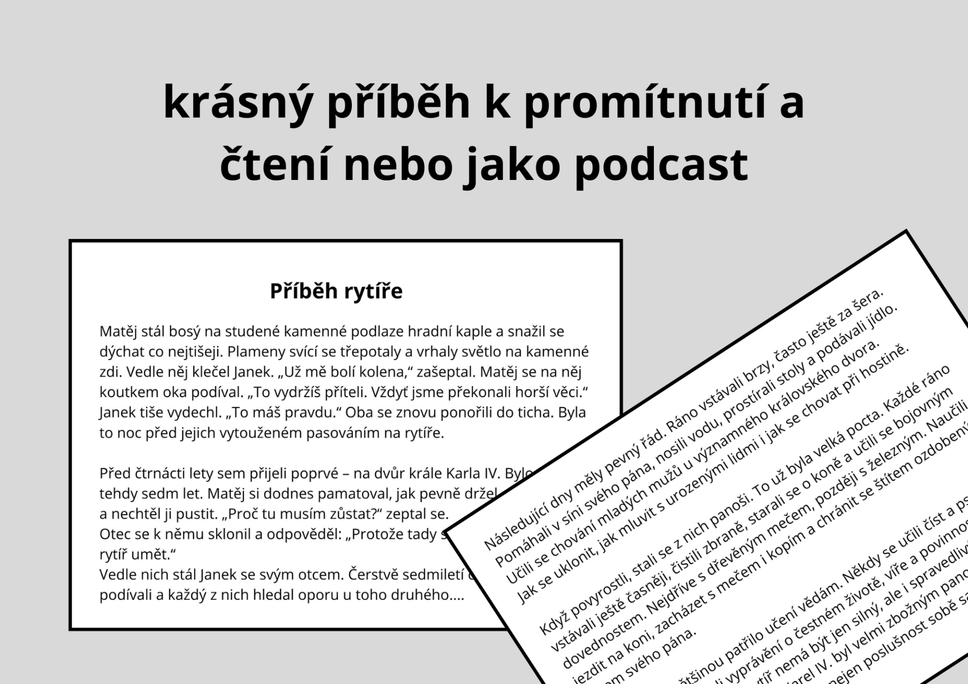 Základním prvkem materiálu je autorský příběh o dvou chlapcích, Matějovi a Jankovi, kteří procházejí dlouhou cestou od dětství až k pasování na rytíře . Tento příběh slouží jako hlavní motivační linie celé výuky. Žáci jej mohou nejen číst, ale také poslouchat díky dostupné audioverzi (podcastu), což výrazně podporuje porozumění textu, práci s intonací a zapojení různých stylů učení. Kombinace čtení a poslechu umožňuje zapojit i slabší čtenáře a přirozeně diferencovat výuku.