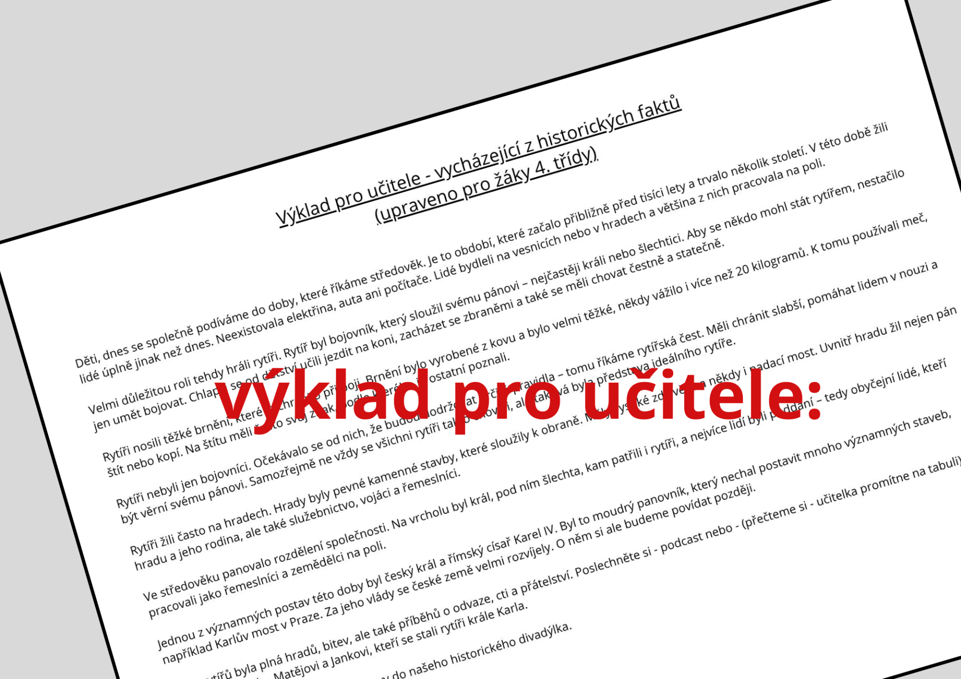 Na příběh navazuje výklad pro učitele, který poskytuje historický kontext a vysvětluje základní pojmy spojené se středověkem – postavení rytířů, jejich výchovu, život na hradě i společenské uspořádání . Tento výklad je formulován jednoduše a srozumitelně pro žáky 1. stupně, takže jej lze přímo využít při výuce bez nutnosti složitých úprav.