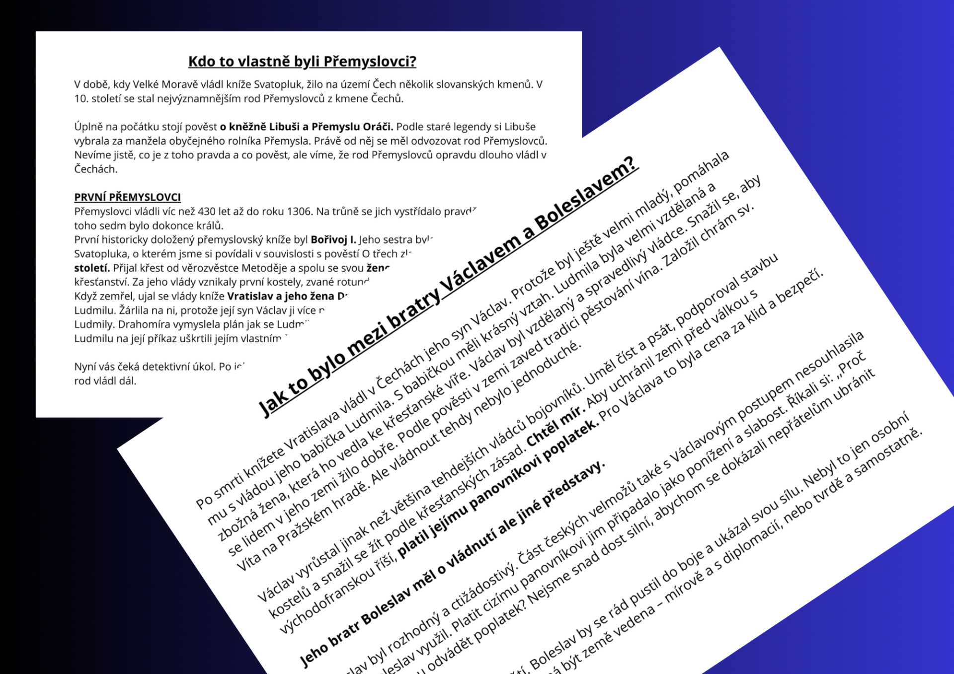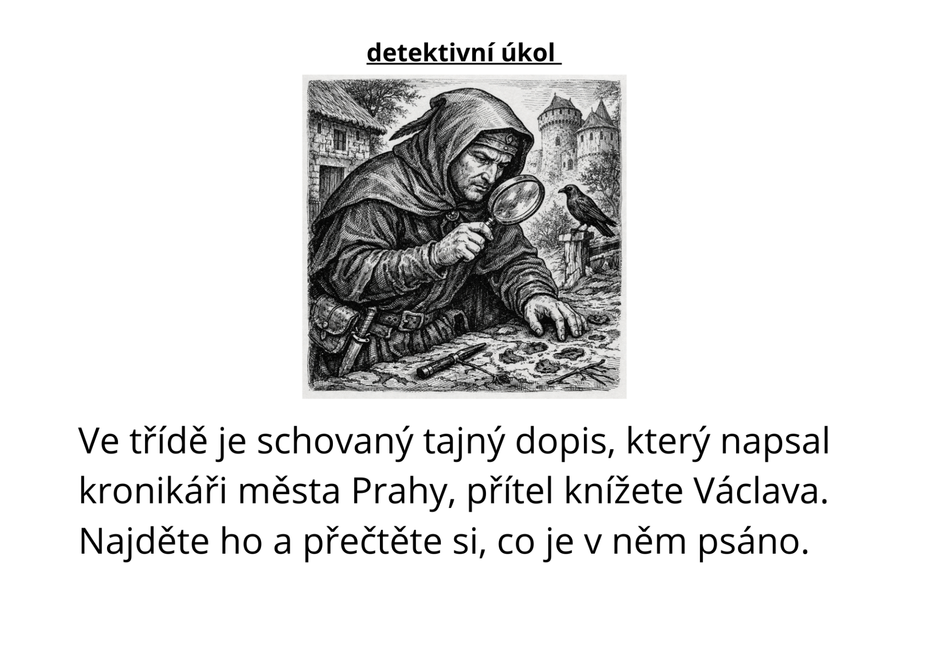Hodina začíná vyprávěním o prvních Přemyslovcích a situaci v 10. století. Učitel děti uvede do doby, kdy v Čechách vládl kníže Václav, který se snažil vládnout mírově a podporoval křesťanství. Postupně se odhaluje napětí mezi Václavem a jeho bratrem Boleslavem a otázka, jak má být země vedena – zda diplomacií a snahou o mír, nebo silou a rozhodností. V této části je vhodné čtení přerušit a zařadit detektivní úkol. Ve třídě je ukrytý tajný dopis, který napsal přítel knížete Václava kronikáři. Děti pracují ve skupinách, dopis hledají, čtou a snaží se porozumět tomu, co se skutečně stalo. Tím dochází k aktivnímu zapojení žáků a rozvoji čtení s porozuměním.