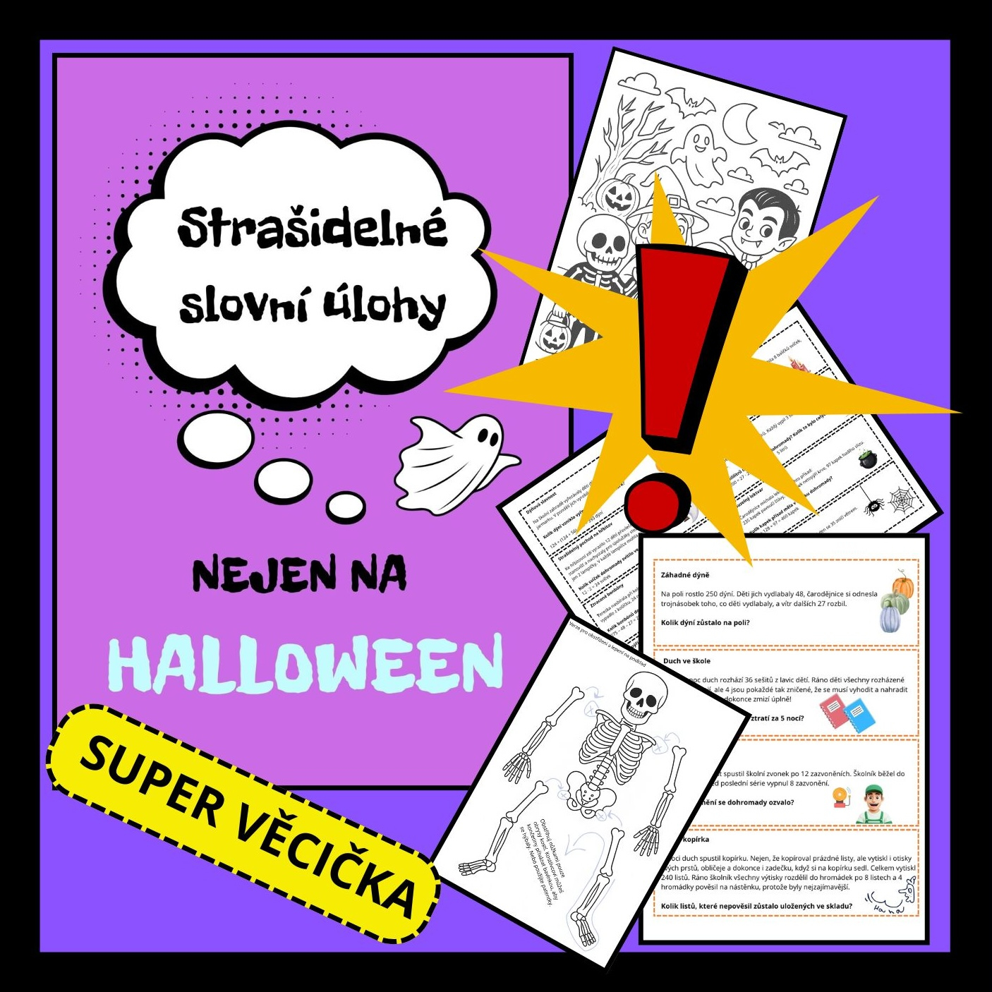 Strašidelně zábavná matematika je tady! Připravila jsem halloweenský soubor plný slovních úloh, které děti zaručeně vtáhnou do děje – potkají duchy, čarodějnice, kostlivce i školní strašidla... 16 úloh, 3 omalovánky + kostlivec
