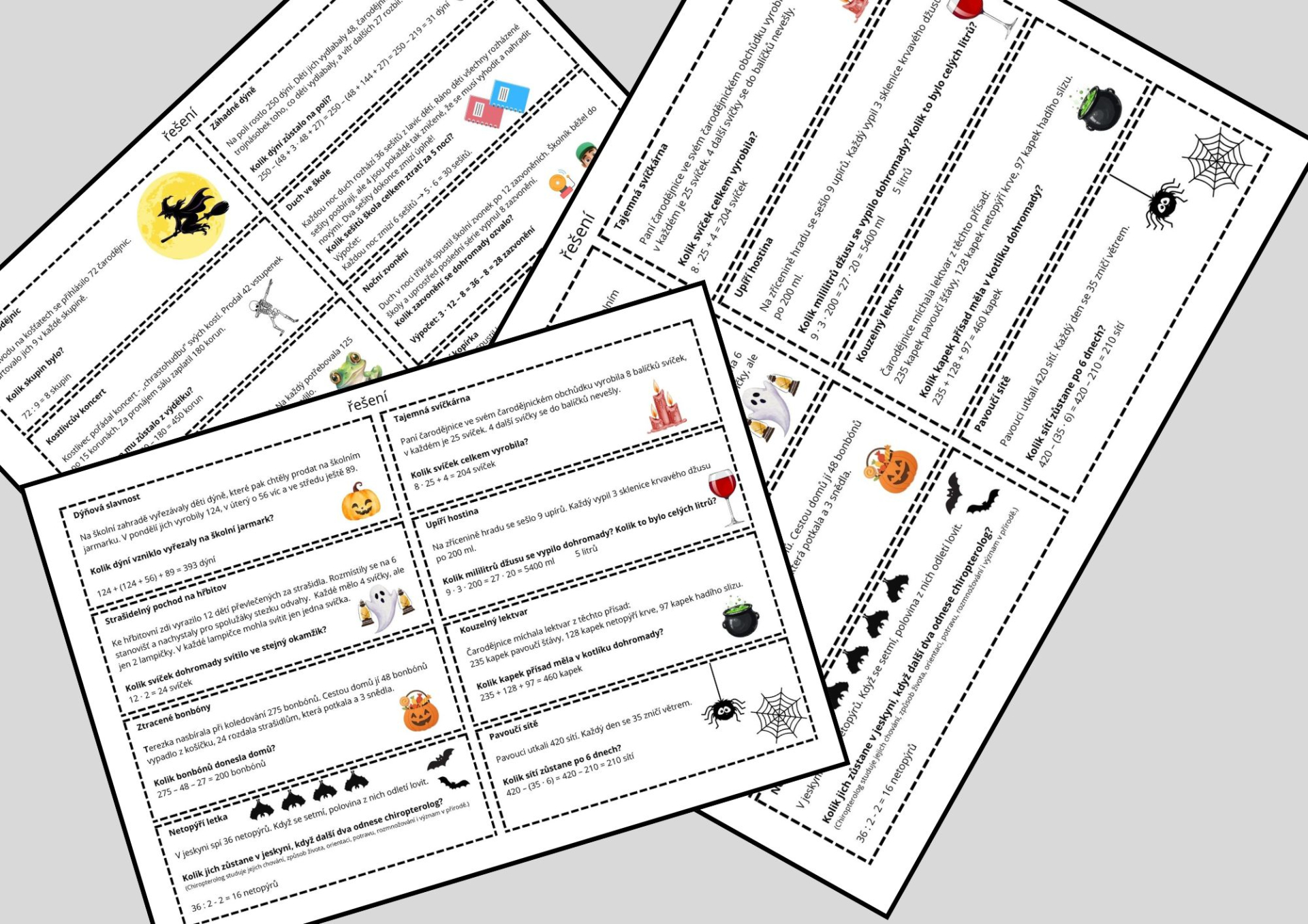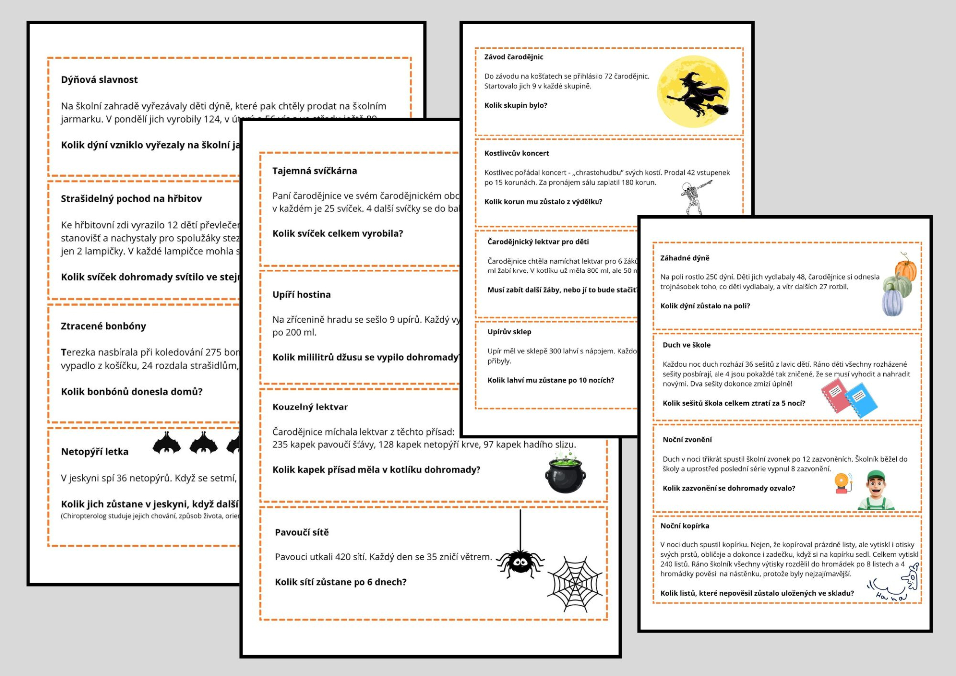 Chtěla jsem, aby si děti užily matematiku trochu jinak, hravě a s tajemnou atmosférou, a myslím, že se mi to opravdu povedlo. Připravila jsem sérii 16 slovních úloh na téma Halloween, ve kterých vystupují duchové, čarodějnice, kostlivci i děti a škola. Úlohy jsou propojené, ale zároveň dostatečně samostatné, takže se dají použít různými způsoby.