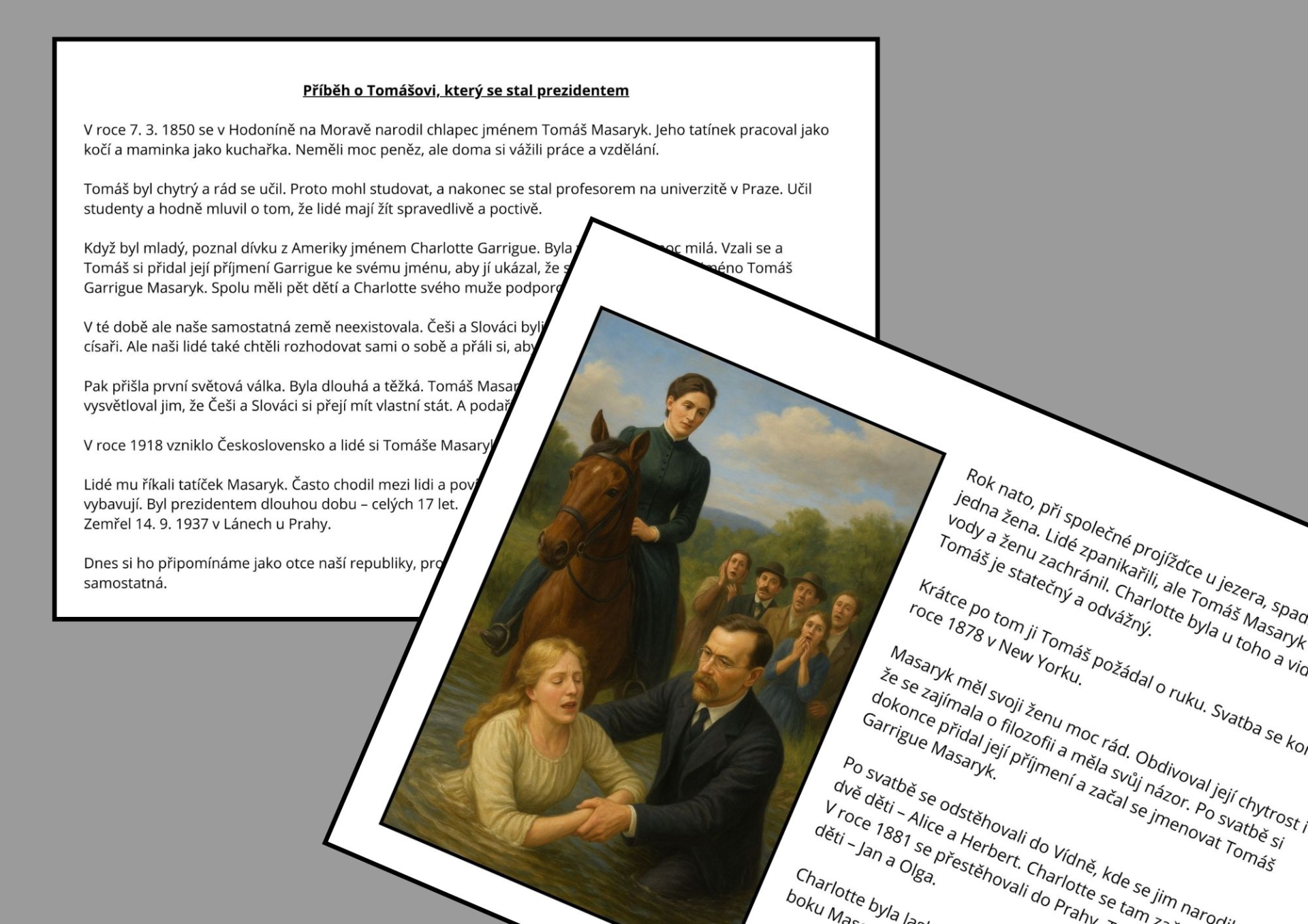 Materiál vznikl z mé potřeby vysvětlit dětem Masarykův život tak, aby si ho dokázaly skutečně představit. Aby pro ně nebyl jen jménem v učebnici, ale člověkem, kterému by mohly napsat dopis, položit otázku nebo ho nakreslit.