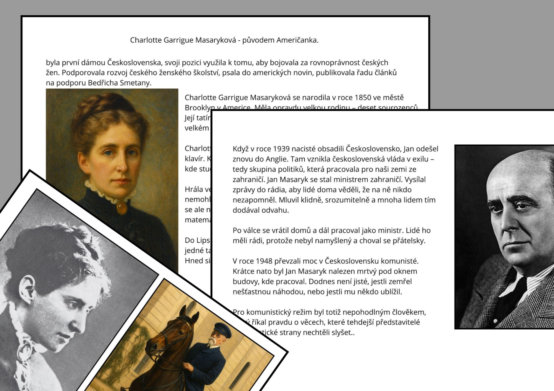 tento didaktický materiál jsem vytvořila pro výuku vlastivědy ve 4. a 5. ročníku základní školy. Mým cílem bylo představit dětem osobnost Tomáše Garrigua Masaryka, jeho ženy Charlotte a jejich syna Jana Masaryka srozumitelnou a blízkou formou, která se dá využít přímo v hodině, bez nutnosti složité přípravy.