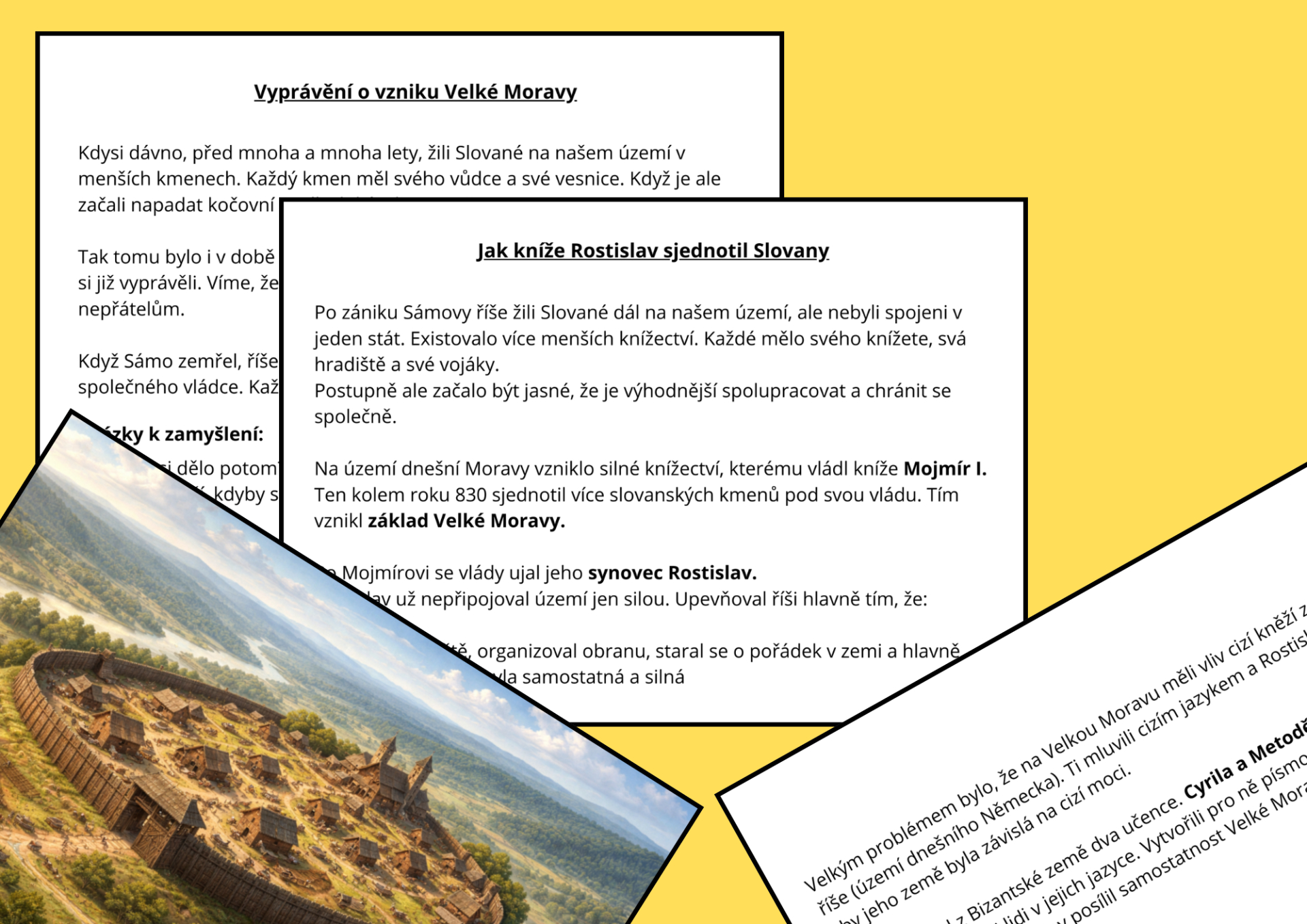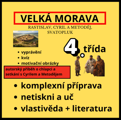 Materiál Velká Morava – Rastislav, Cyril a Metoděj, Svatopluk je připraven jako kompletní a ucelená příprava pro výuku vlastivědy i literatury ve 4. ročníku základní školy. Spojuje historické učivo s literárním prožitkem a umožňuje dětem poznat toto důležité období nejen prostřednictvím faktů, ale i příběhu, obrazu a vlastní aktivity. Materiál je koncipován tak, aby jej bylo možné využít jako plnohodnotnou vyučovací hodinu nebo tematický blok, případně jej rozdělit do více vyučovacích hodin podle potřeb učitele.