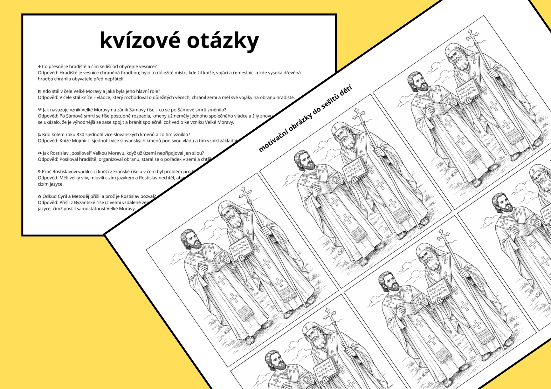 Materiál obsahuje rozsáhlou obrazovou přílohu ve formě motivačních ilustrací, které zobrazují hradiště, život ve Velké Moravě, kovárnu, příchod Cyrila a Metoděje, jejich výuku i významné historické momenty, například přijetí bratří knížetem Rostislavem nebo symbolický pád Velké Moravy. Obrázky pomáhají žákům lépe si představit historické prostředí a podporují jejich vizuální paměť. Součástí materiálu jsou také černobílé obrázky vhodné k vybarvování, které mohou žáci vlepit do sešitu nebo využít jako motivační aktivitu.