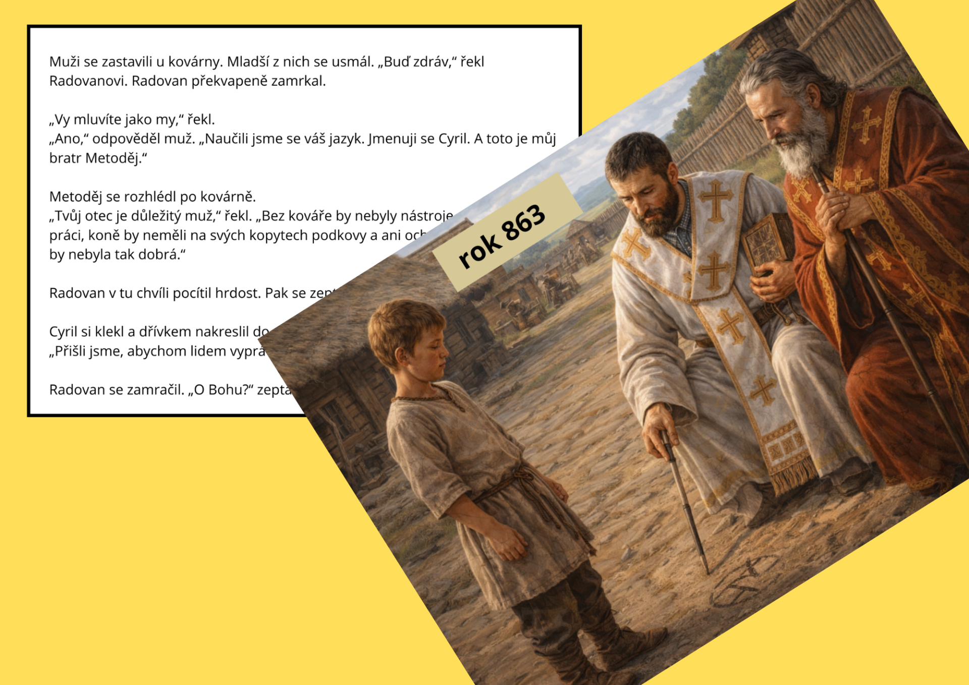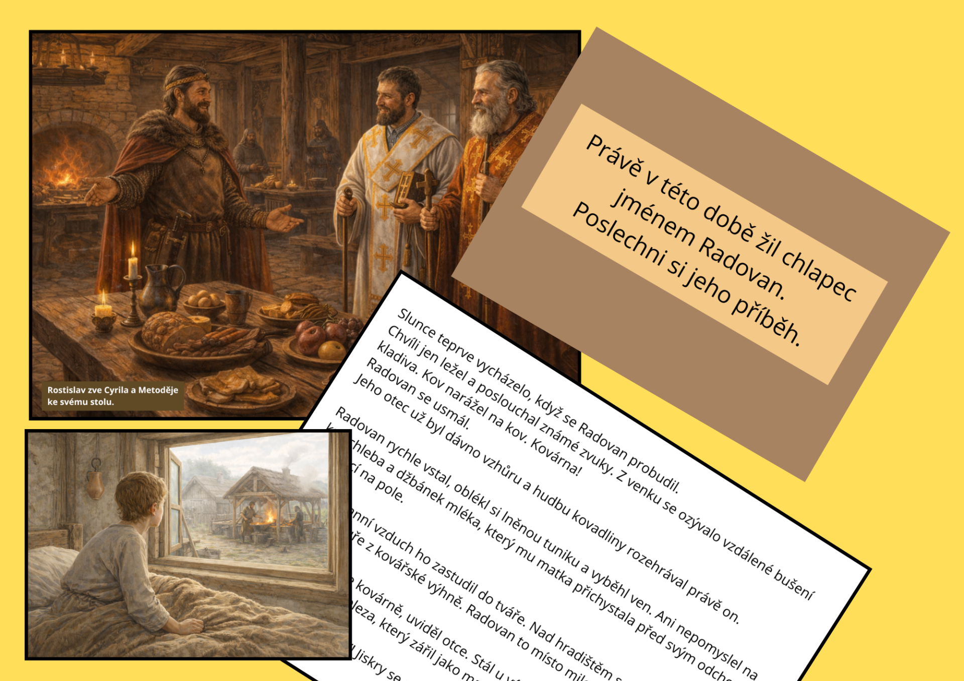 Důležitou součástí materiálu je autorský příběh o chlapci Radovanovi, synovi kováře, který žije v hradišti a osobně se setkává s Cyrilem a Metodějem. Tento příběh umožňuje žákům vcítit se do života dětí v období Velké Moravy, pochopit význam písma, víry a vzdělání a lépe si zapamatovat historické souvislosti. Vyprávění je psáno emotivním a obrazným jazykem a propojuje historická fakta s osobním prožitkem dítěte.