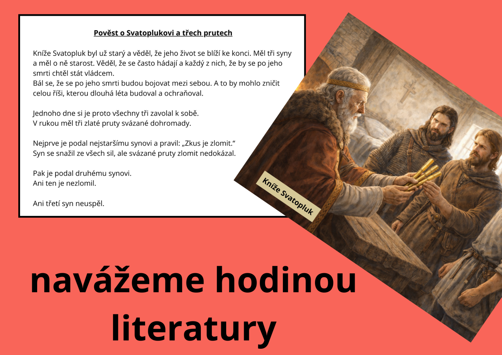 Materiál je možné využít také v hodině literatury, kde navazuje na pověst o knížeti Svatoplukovi a jeho třech synech a třech zlatých prutech. Tato pověst dětem srozumitelně vysvětluje význam jednoty, spolupráce a vzájemné soudržnosti. Zároveň pomáhá žákům pochopit skutečné historické události, které vedly k oslabení a zániku Velké Moravy. Text pověsti je doplněn otázkami k zamyšlení, které rozvíjejí čtenářskou gramotnost, schopnost interpretace a morální uvažování.