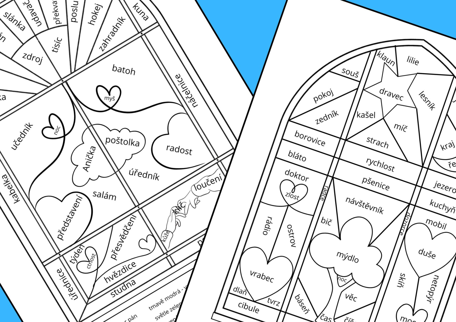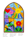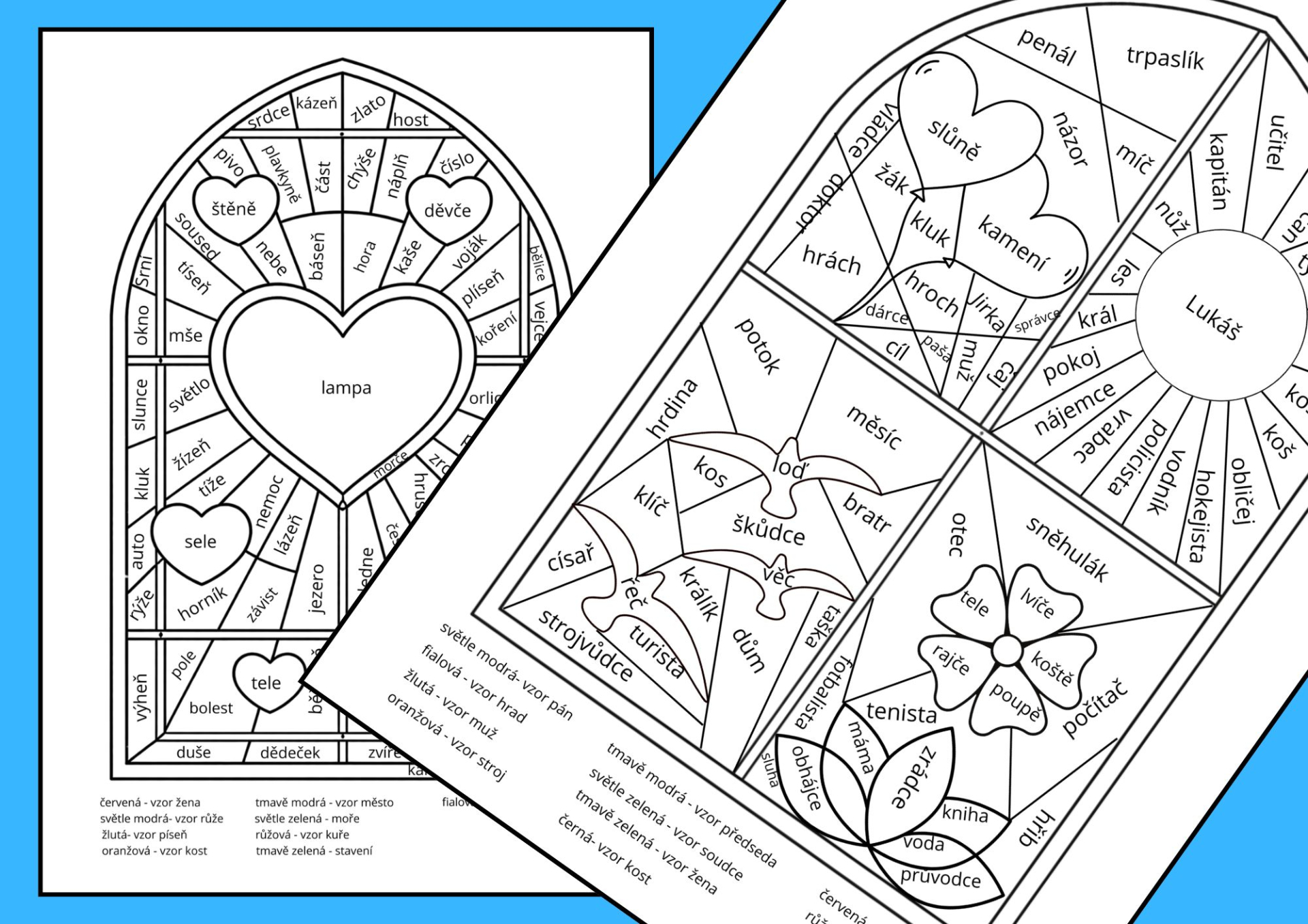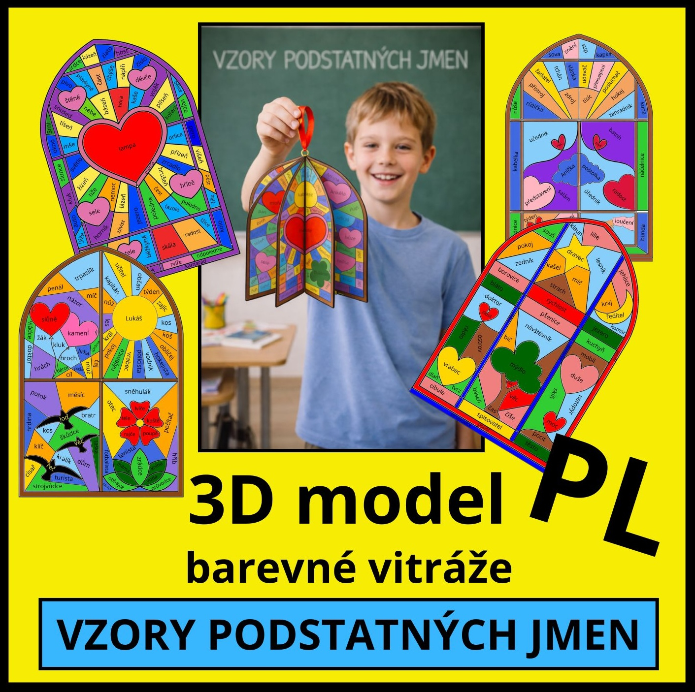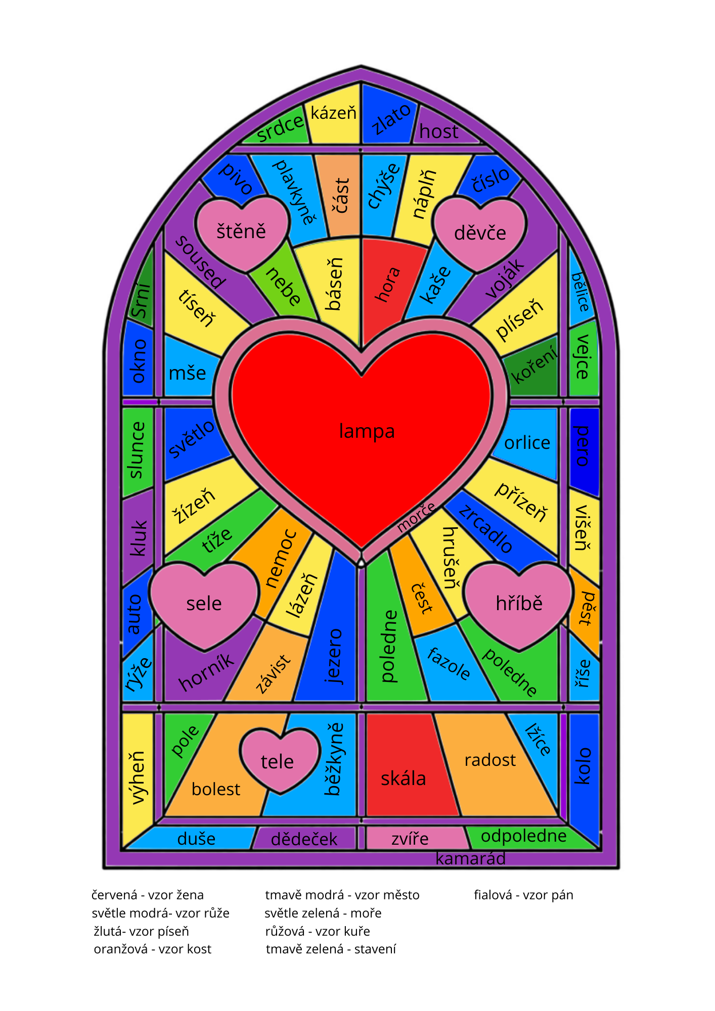 Materiál je zpracovaný jako pracovní listy - okénka s mozaikou - vitráží, ve kterých jsou slova různých rodů a vzorů. Každý vzor má svou barvu napsanou dole pod okénkem v legendě.